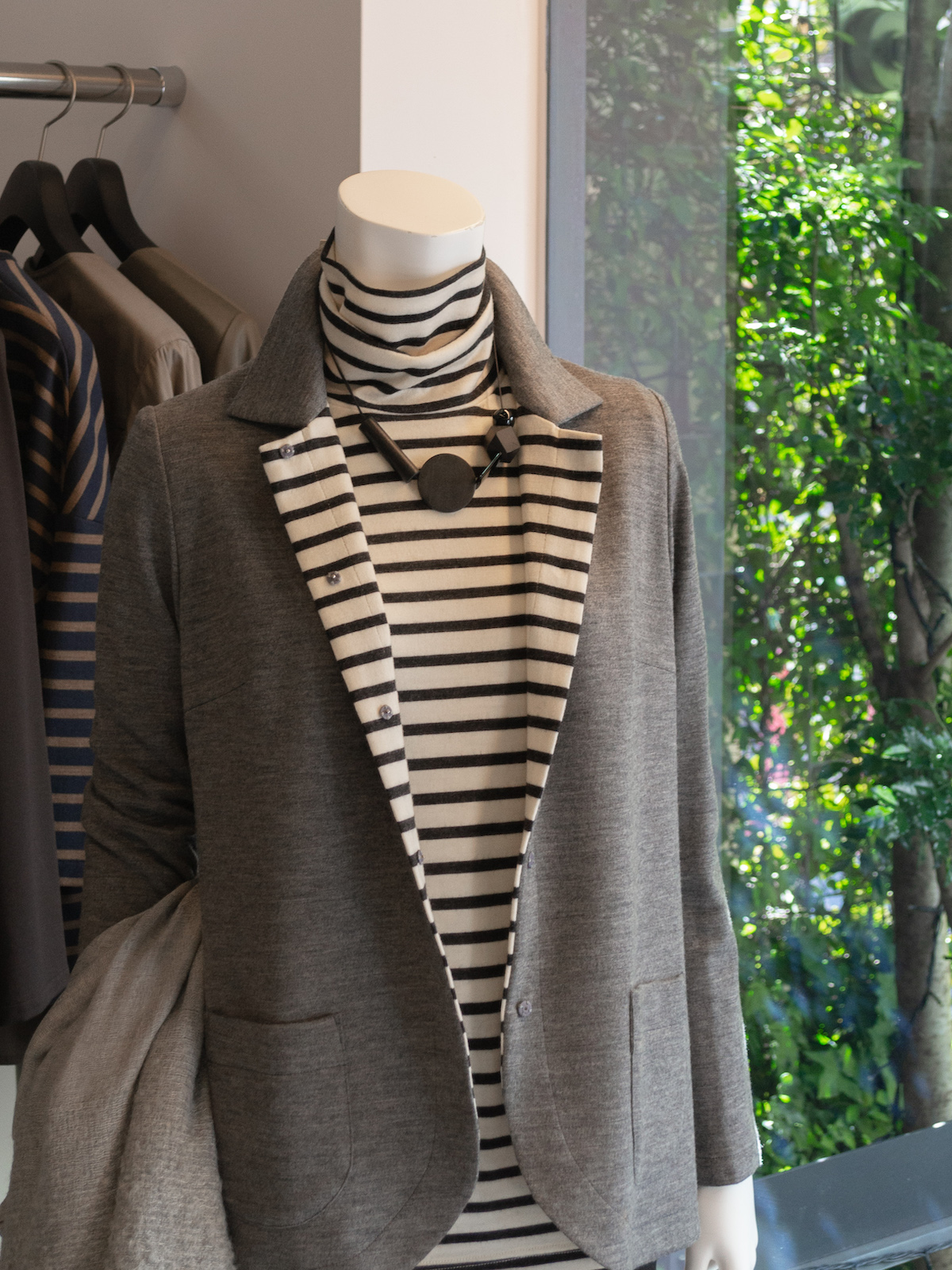 ジャケットの内側とタートルネックのカットソーが揃ったアンサンブル。