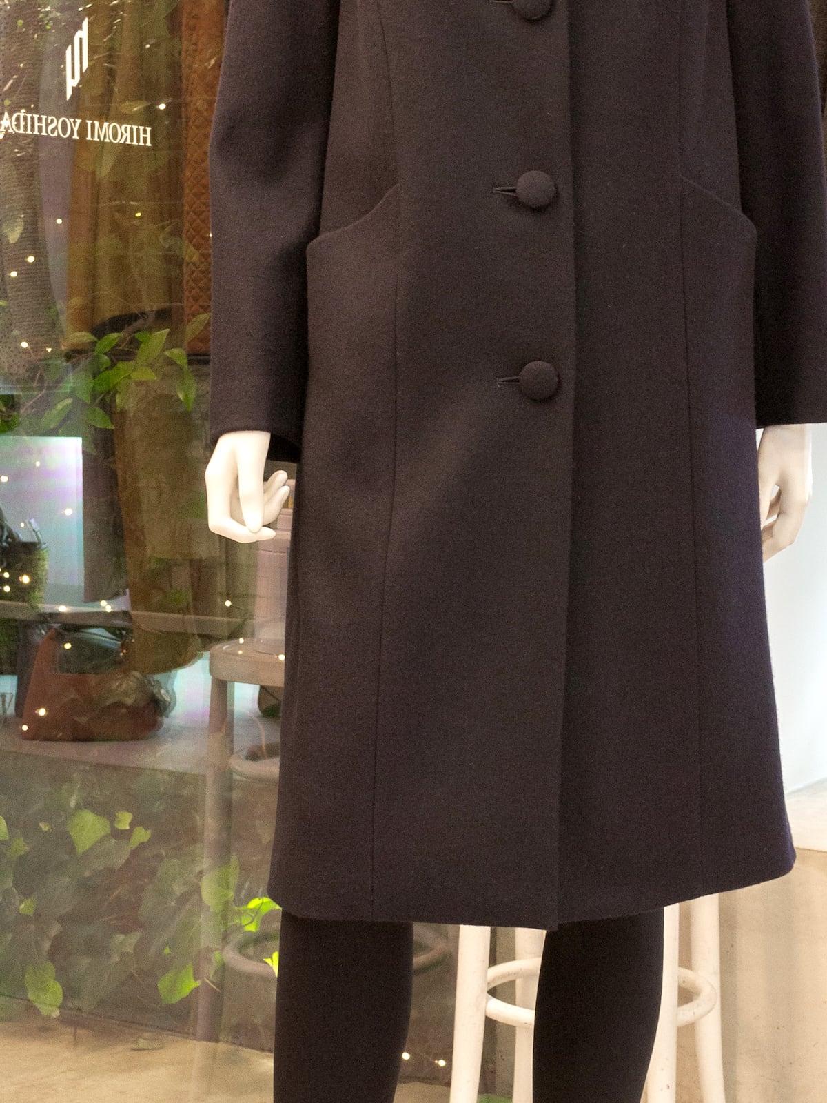 紺のスタンドカラーのコートはきちんと感、女性らしさがあり、学校関係や催し物などそれなりの場所に着ていただける役立つ一品です。