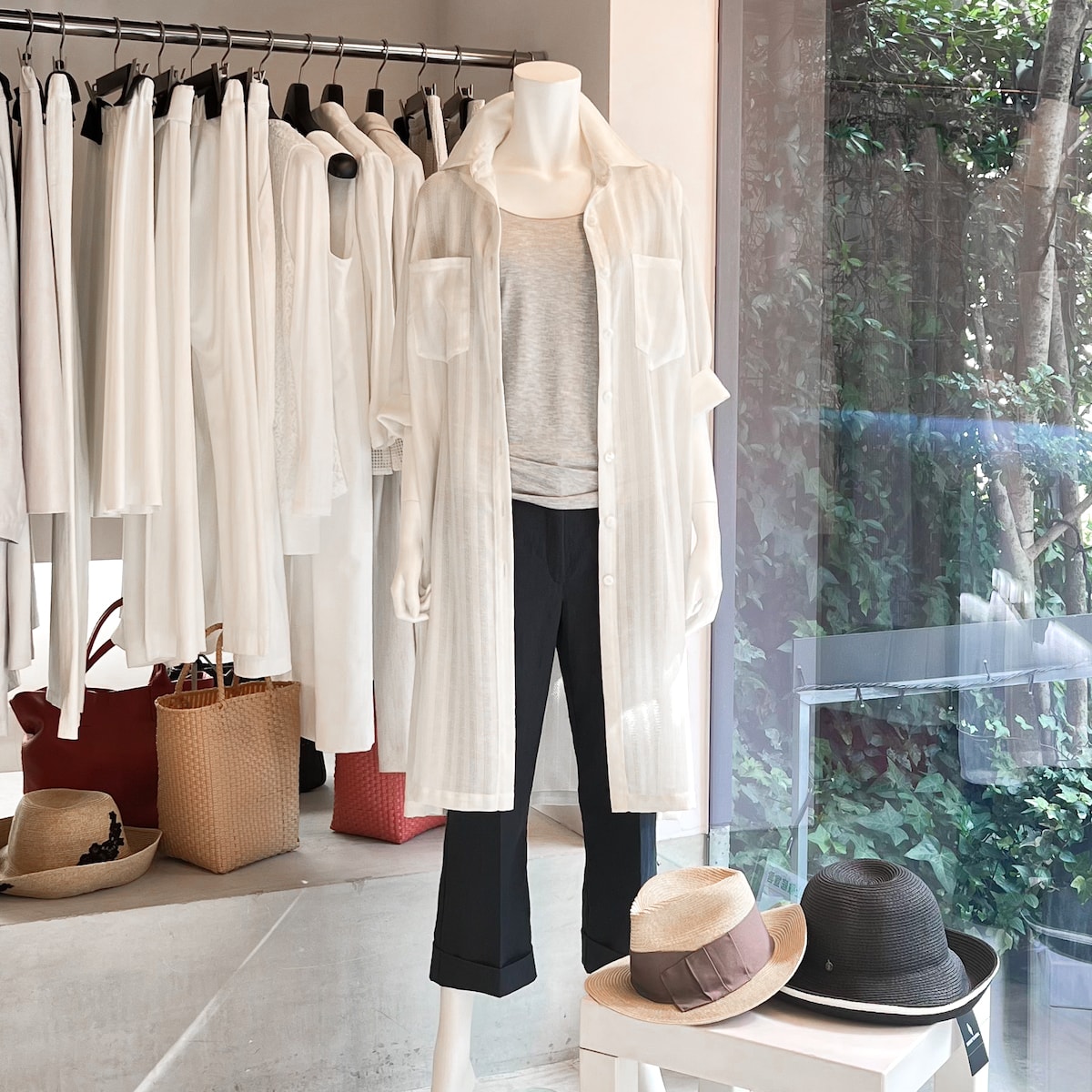 夏の暑さにも、透け感のある五分袖のロングジャケットは涼しさを感じさせる。
